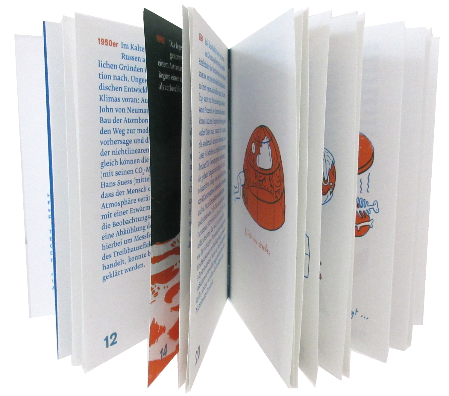 Der Farbverlauf, sichtbar am Buchrücken und im Falz, steht für die Temperaturerwärmung – während gelesen wird, wird’s wärmer.